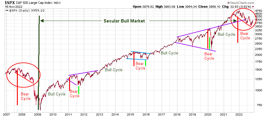 The two primary long term trends of the stock market are either a secular bull market or a secular bear market.