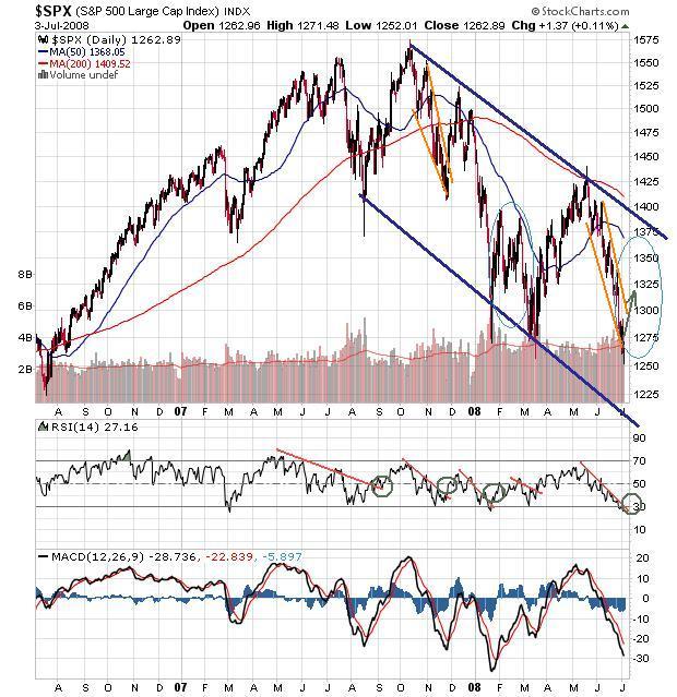 In summary, we believe the S&P will bounce in price from current levels. The 50-dma will probably serve as resistance. If for some chance that level is exceeded, then two other significant levels of resistance are not far away (i.e., the downtrend since October '07 and the 200-dma). We strongly believe any rally attempt will come to a scretching hault at one of these levels of resistance. In our opinion, the current charting pattern will perform much like the rally in late-Nov/early-Dec '07 (i.e., a bounce followed by a massive collapse in price).