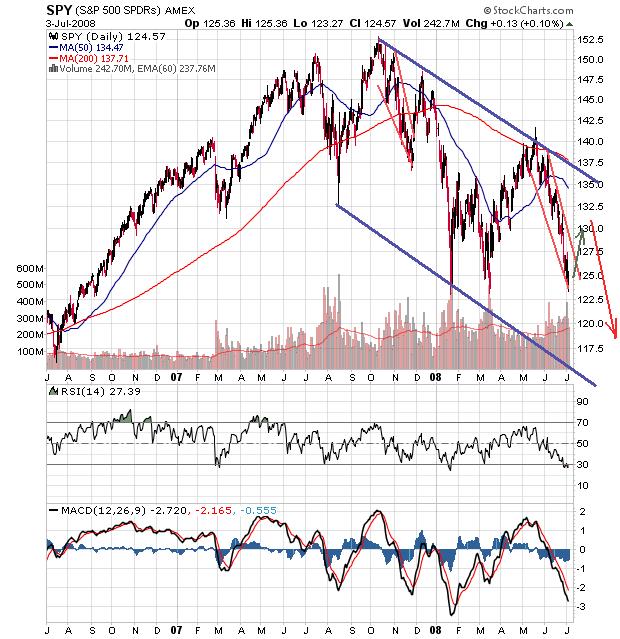 Our viewpoint on SPY is "short-term bullish." The exact same trading logic for DIA can be applied to SPY. For the past 1 1/2 months, SPY has been plummeting in price since mid-May '08. A bounce back to the 50-dma will be interpreted as a countertrend rally that is destined to fail at resistance. Soon we will return to a short sell position. We are alerting our members that the next time the index declines, it has potential of being quite significant.